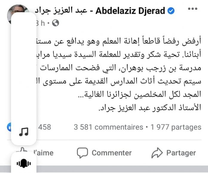 En effet, il oppose un refus catégorique à l’humiliation subie par l’institutrice hier à Oran, désavouant le comportement du wali et apportant un franc soutien à la dame qui a su, avec courage énumérer les défaillances et les insuffisances constatées lors de la rentrée scolaire qui a eu lieu mercredi et qui a dévoilé les anciennes pratiques, dit le premier minoistre. Abdelaziz Djerad a promis de moderniser le mobilier ancien de toutes les écoles du pays.