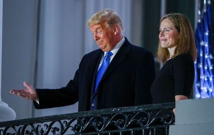 A une semaine d’une élection où il n’apparaît toujours pas en position favorable, Donald Trump n’a pas boudé son plaisir, lundi 26 octobre, dans la soirée. Au retour de trois meetings tenus en Pennsylvanie, il a organisé à la Maison Blanche la prestation de serment d’Amy Coney Barrett, officiellement nommée à la Cour suprême par un vote du Sénat (52 voix pour, 48 contre) peu avant, saluant « un jour historique pour l’Amérique ». L’arrivée de la juge conservatrice au sein de cette institution offre au président américain une victoire qui, quel que soit le résultat du scrutin du 3 novembre, aura des effets bien au-delà de son mandat.