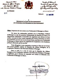 Le ministre des affaires étrangères du Maroc, Nasser Bourita a adressé un courrier à toutes les institutions de son pays y compris son chef du gouvernement les invitant « à suspendre tout contact, interaction ou action de coopération en aucun cas et sous aucune forme avec l’ambassade d’Allemagne ainsi que les organismes de coopération et les fondations politiques allemandes qui lui sont liés. » Bourita justifie cette décision par le fait, selon le document dont l’Espoir Libéré s’est procuré une copie, « de malentendus profonds avec la république fédérale d’Allemagne au sujet de questions fondamentales du royaume du Maroc. Il y est fait état, également de la suspension de tout contact ou démarche entre le ministère de Bourita et l’ambassade germanique. »