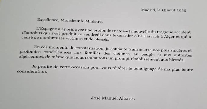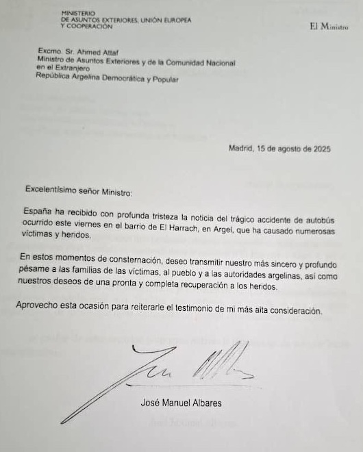 « Le Ministre des Affaires Étrangères, l’Union Européenne et la Coopération, José Manuel Albares a adressé ses sincères condoléances aux familles des victimes du terrible accident d’El Harrach, ainsi qu’au peuple et aux autorités de l’Algérie », rapporte, ce jeudi 21 août 2025, l’Ambassade d’Espagne en Algérie.
