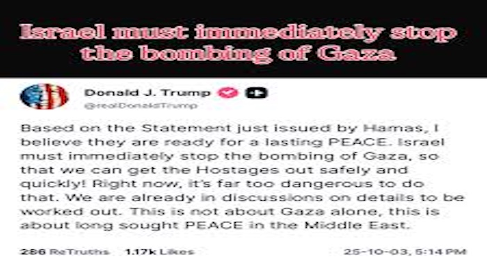 Alors que le HAMAS a répondu à l’initiative (plan de paix) de Trump relative à la sortie de crise dans Ghaza, se disant prêt à libérer tous les captifs vivants et morts en une seule fois, ce dernier a, dans une publication sur sa plate-forme, ordonné à l’entité sioniste de stopper IMMÉDIATEMENT ses bombardements sur Ghaza pour permettre l’exécution de l’opération dans des conditions sécurisées et vite.