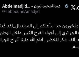 Dans un message sur son compte personnel sur (X), le Président de la République, Abdelmadjid Tebboune a félicité, ce jeudi, les Verts suite à leur qualification au mondial 2026.